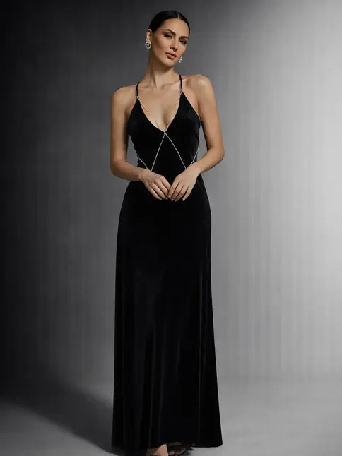 Приголомшлива вечірня сукня в стилі Голлівуд - створена для максимального гламуру та бездоганного комфорту одночасно. Виготовлена з м’якого благородного велюру, вона формує розкішний образ, готовий до камер і світла софітів. Ідеально підходить для різдвяних вечірок, новорічних святкувань, гала-подій, урочистостей та червоних доріжок. Елегантний відкритий виріз на спині та тонкі бретелі підкреслюють фігуру, а оздоба стразовою стрічкою на грудях яскраво сяє під освітленням. Довжина до підлоги та ефектний розріз з боку роблять кожен крок впевненим і граційним.